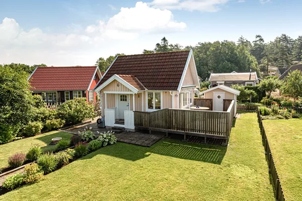 Stugans läge längst in på tomten ger en fina ytor framför med gräsmatta för lek och spel. Här har man också, blomsterprakt, fruktträd och buskar, vissa med bär. Bakom stugan finns gott om plats för odling i pallkragar.