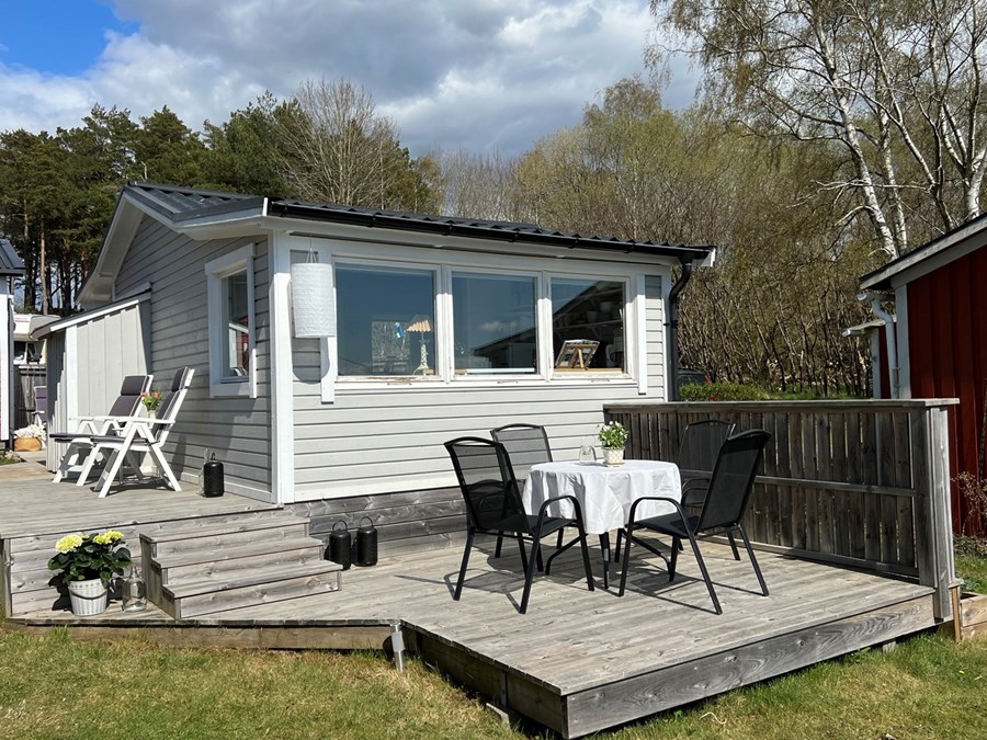 Stugan är stilrent och optimalt planerat med smarta förvaringslösningar, fina ytskikt och fönster i flera väderstreck och med utsikt mot Askimsviken