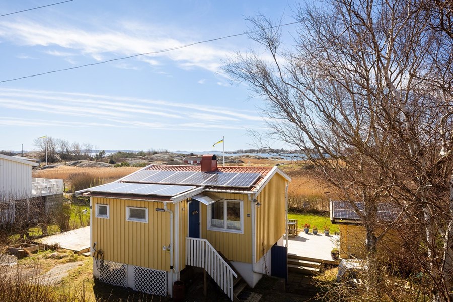Havsnära stuga med fri utsikt, stor altan, solceller och eldstad. Ett unikt läge i idylliska Torslanda Havsbadskoloni.